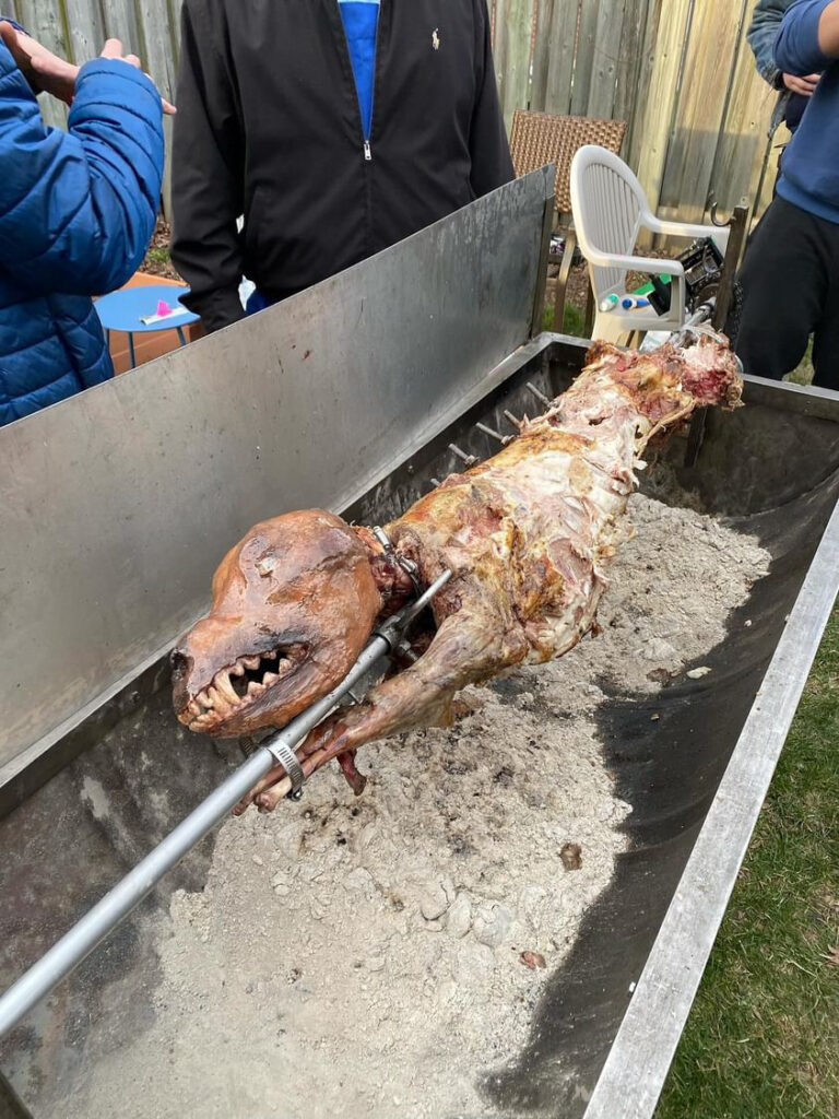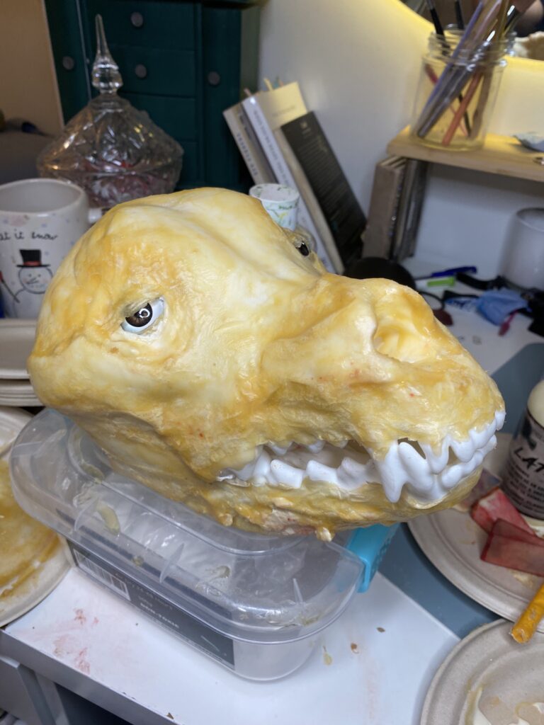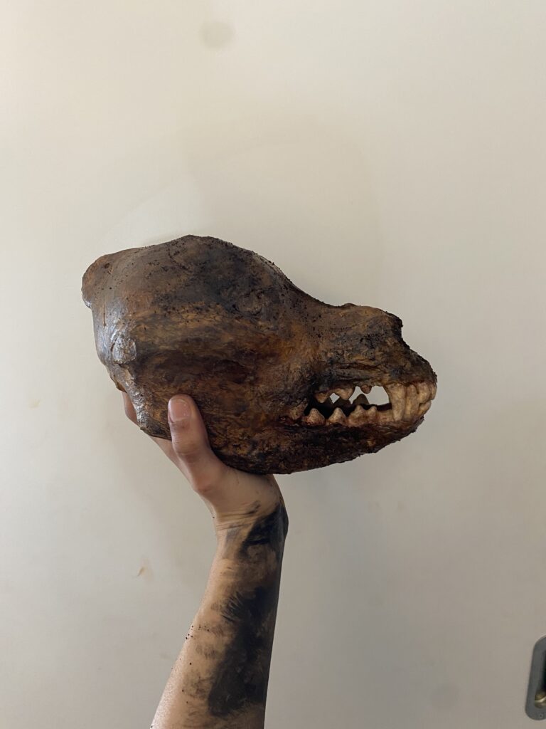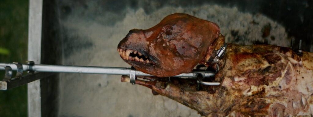I printed a life size anatomic skull of the dog breed I was recreating as a base for my sculpt. Than using foam clay, paint, liquid latex, fake glass eyes and coffee grounds I created the look of a charred dog head. In charge of this specialty prop I also mounted and colour matched the prop on set for the most accurate colour match with the rest of the meat on the spit.
