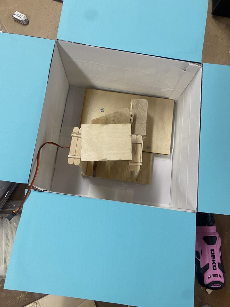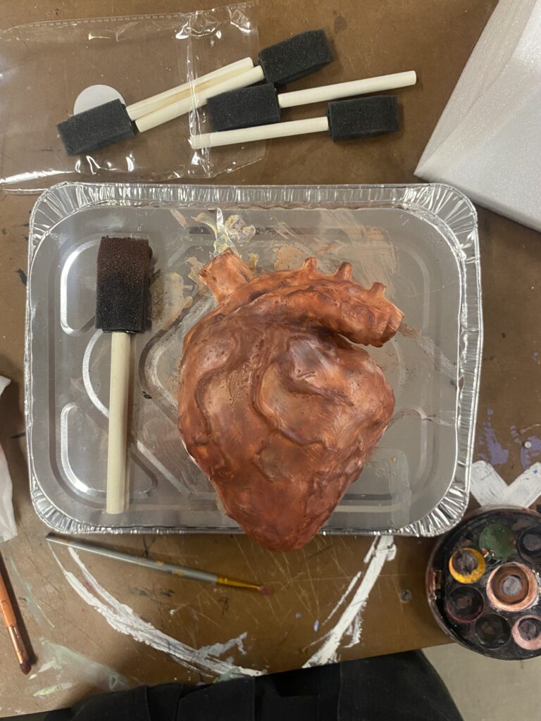 I chose to create an anatomical heart sculpture made with paint and foam clay. I placed the sculpture in a box with the robotic components to cover them. Mounting the heart on a servo with a piston so that it can move up and down towards the camera and give the illusion of the heart beating.
